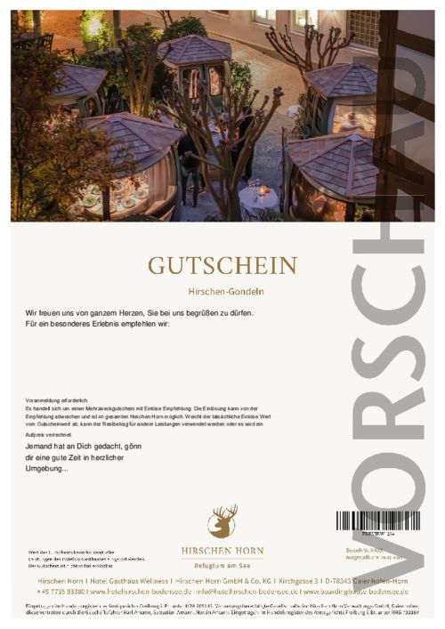 Wir erfüllen wahre Wünsche, zaubern strahlende Augen und schaffen Herzensmomente! Genau jetzt und hier, ganz einfach mit ein paar Klicks. Wir haben unsere Schokoladenseiten – von Wellness bis Wohnen, von Genuss bis Erlebnis – für Sie zusammengestellt. Verschenken Sie das Glück oder verwöhnen Sie sich selbst! Alle Gutscheine und Tickets für Hirschen-Veranstaltungen können Sie hier online kaufen und bequem zuhause ausdrucken.